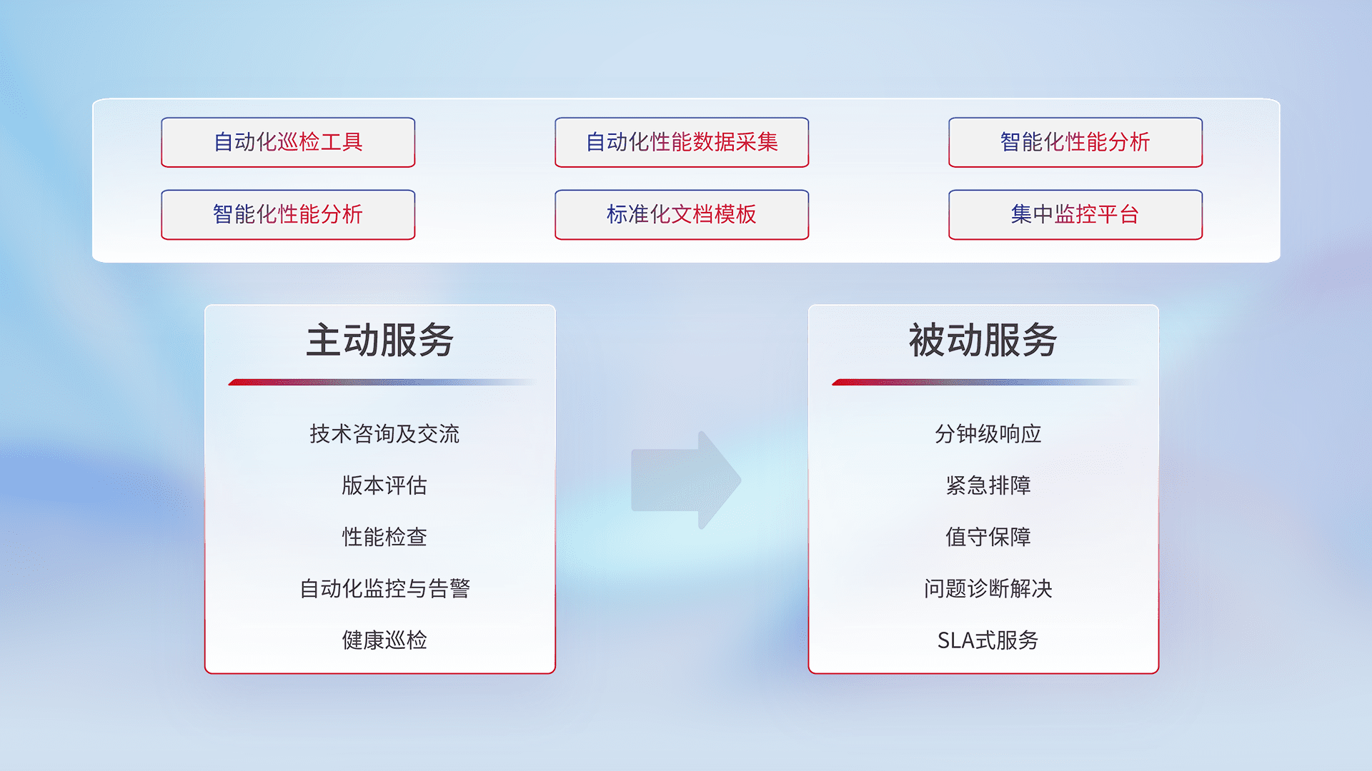 智能化工具和标准化文档,,保障服务质量,,提供主动服务(包含技术咨询、、版本评估、、性能检查、、自动化监控与告警、、、健康巡检)和被动服务包含(分钟级响应、、紧急排障、、、、值守保障、、问题诊断解决、、、SLA服务)。。。。